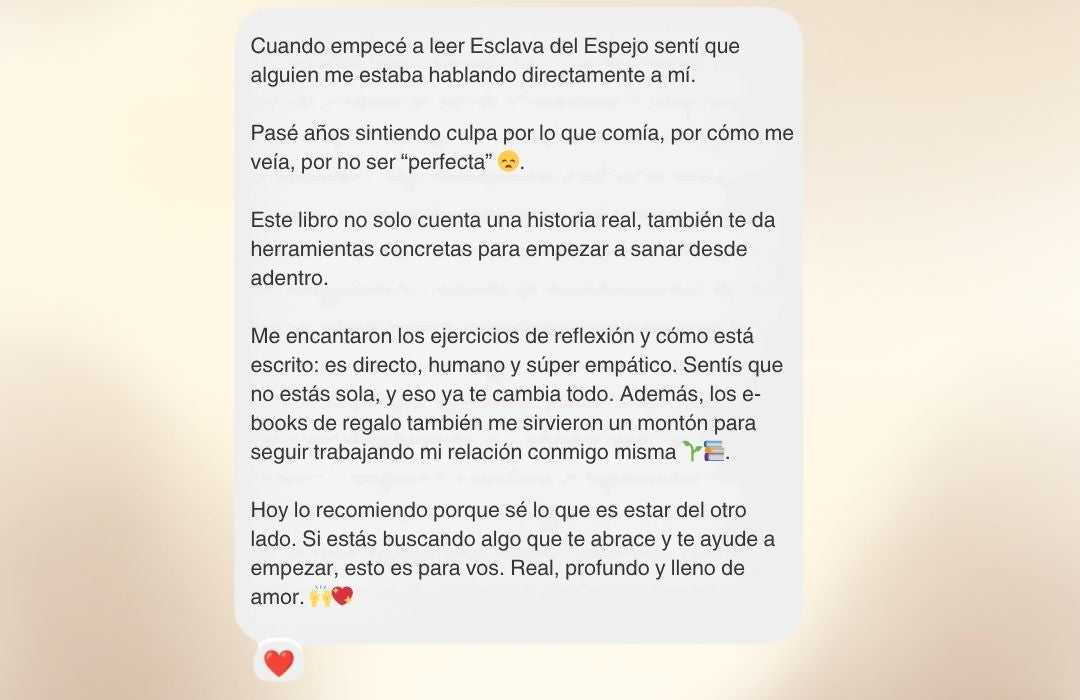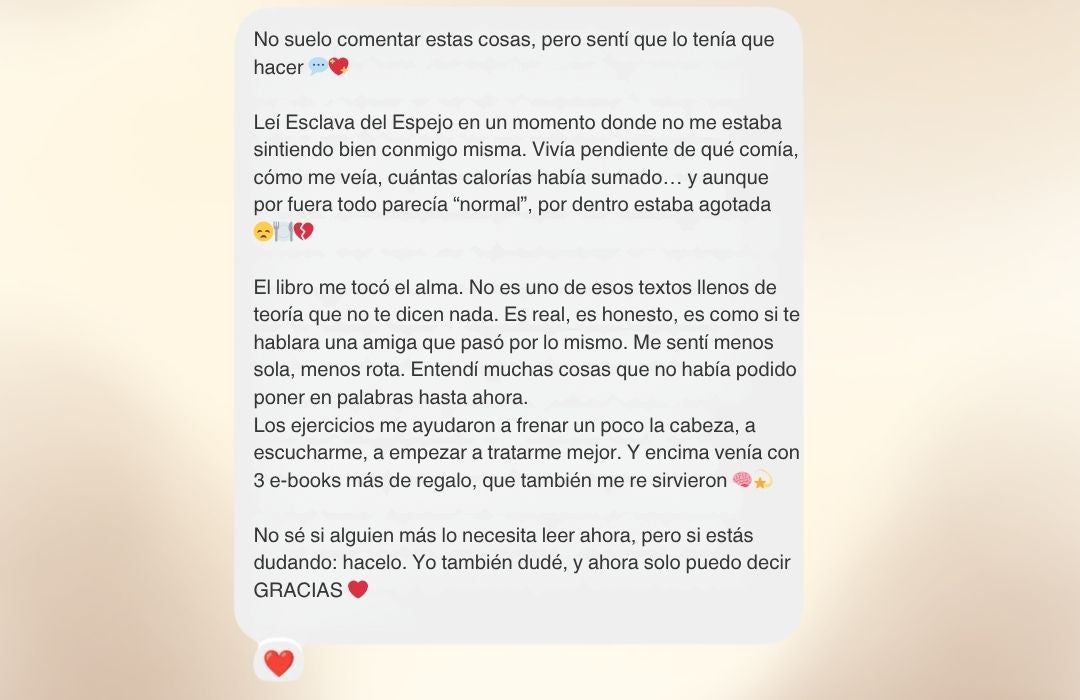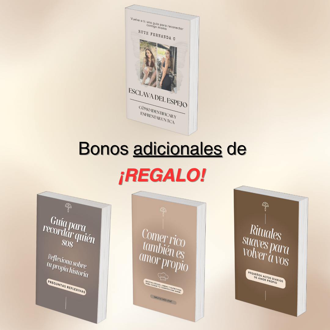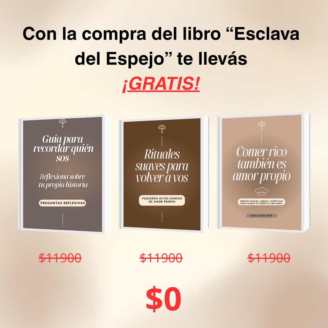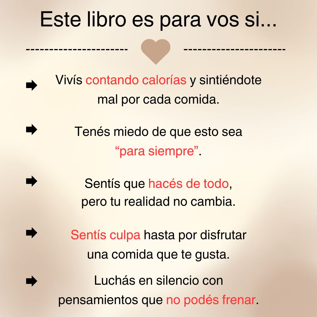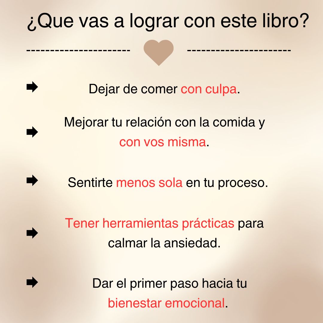Incluye mi historia real, herramientas emocionales y ejercicios prácticos para sanar tu relación con la comida y con vos misma. Solo por hoy, te llevás 3 e-books de regalo para acompañarte en tu proceso.